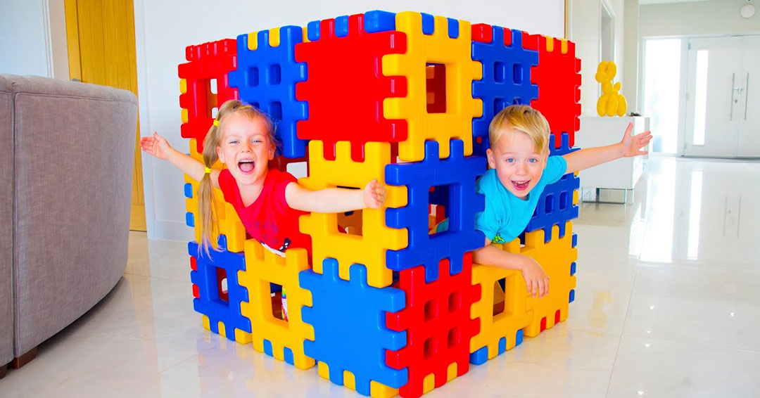 Kids playing with Building Blocks Toys and Building a House